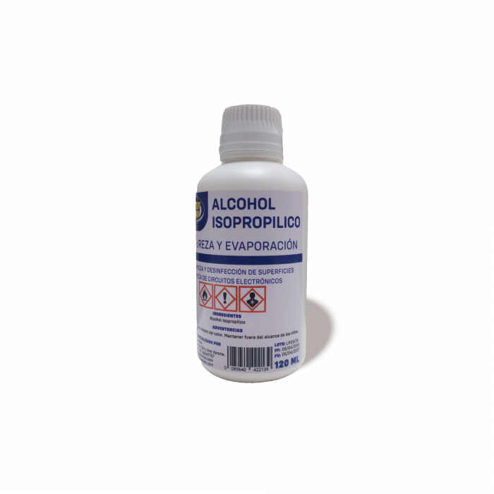 Alcohol isopropílico 120ml de alta pureza, ideal para limpieza y desinfección de superficies, equipos electrónicos y uso técnico.